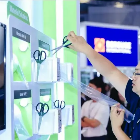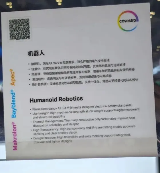 科思创以“材料效应”为主题,带来了从飞行汽车到人形机器人的系统解决方案。在其展台,聚碳酸酯方案应用于机器人结构件可提供卓越抗冲击性能;应用于芯片散热罩可实现高效散热;应用于传感器外壳可利用高红外透过率实现精准环境感知。更有看点的是,科思创的硬质聚碳酸酯薄膜应用于人机交互面板,而柔性TPU薄膜则为机器人灵巧手以及电子皮肤提供了触觉感知能力的材料基底