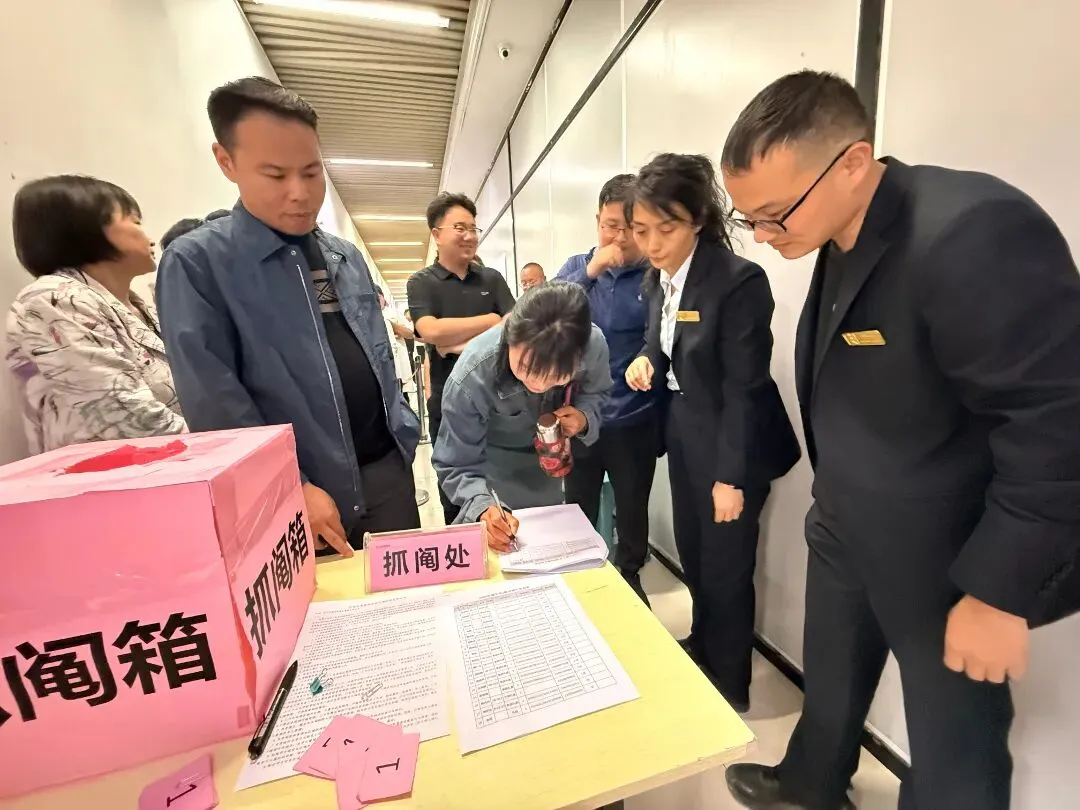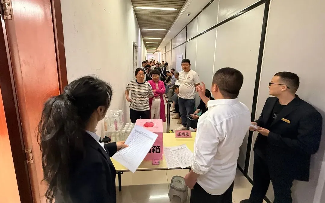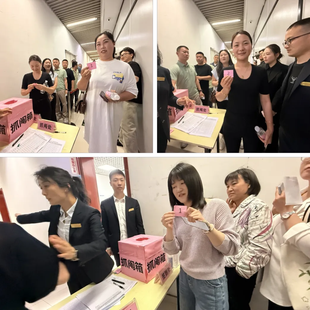 下午2点,抓阄抽号环节正式开始。为提高效率,本次活动采用分批进行,商户们根据所需铺位数量分组排队,现场秩序井然。率先进行抽号的是6间铺位商户,工作人员按照排队先后顺序依次引导抽取“选铺顺序号”。每一位商户抽到的号码都现场公示,并由摄像机全程记录备案,确保过程透明可查。随后,4间、3间、2间和1间铺位的商户分别依次完成抽号,整个流程流畅高效。