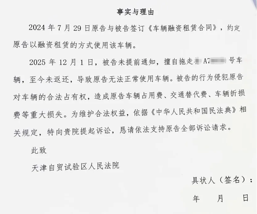 出现了情况:融资租赁公司(买受人/出租人)没有提前通知企业(出卖人/承租人),擅自拖走车辆(标的物),这时候企业如何救济?