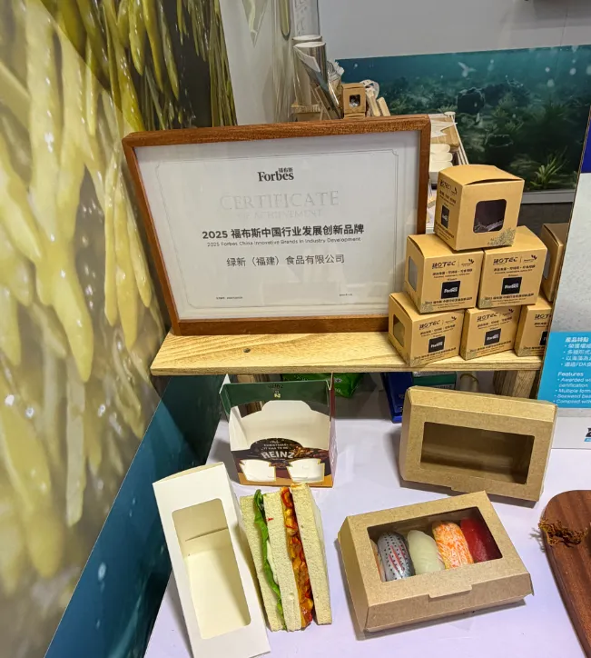 本次展会我们看到了很多以竹代塑、海藻基制成的包装样品。例如在本次展会上企业重点展示竹纤维全生物降解材料及制品,覆盖改性母粒、竹基快递袋、竹基瓦楞箱、竹基一次性餐具等完整产品矩阵。