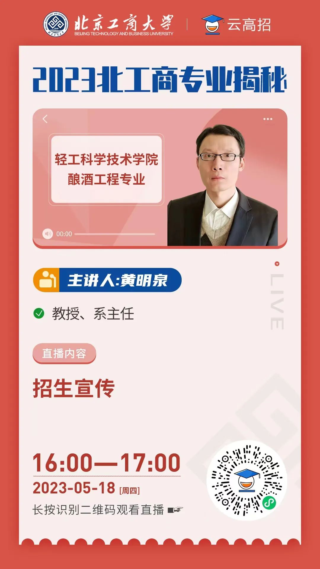 尊敬的各位考生家长,亲爱的同学们,为帮助考生及家长全面了解北工商招生专业目录及招生情况,北京工商大学本招办推出2023年专业揭秘直播宣讲系列活动,本次活动将覆盖我校各院系各专业,以下为酿酒工程专业介绍直播预告,请大家不要错过精彩内容,北京工商大学期待您的到来!
