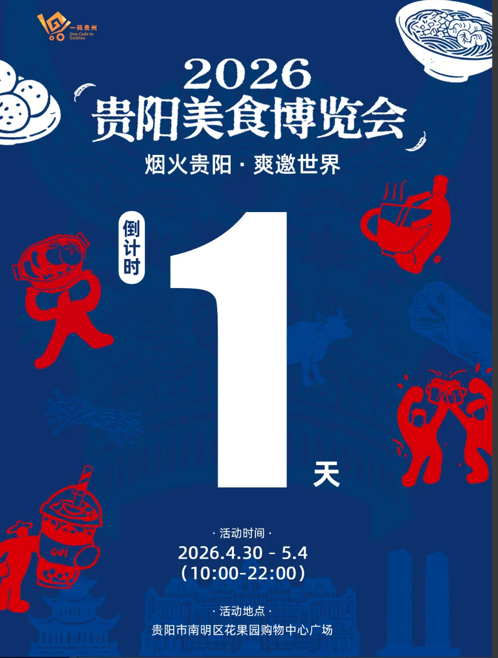 倒计时1天!以“烟火贵阳爽邀世界”为主题的2026贵阳美食博览会,将于4月30日在贵阳花果园购物中心广场盛大启幕。这场由贵州电子商务云运营有限责任公司(一码贵州)、花果园国际文化艺术交流中心、花果园购物中心联合主办的美食盛会,将持续至5月4日,以“展、尝、购、游、赛”五位一体创新模式,集结多家优质品牌商户,打造九大特色主题展区,为市民游客奉上一场全景式沉浸式美食盛宴。开幕在即,本届食博会全系列重磅活动与福利玩法正式解锁,线上线下双重联动,惊喜福利层层加码。