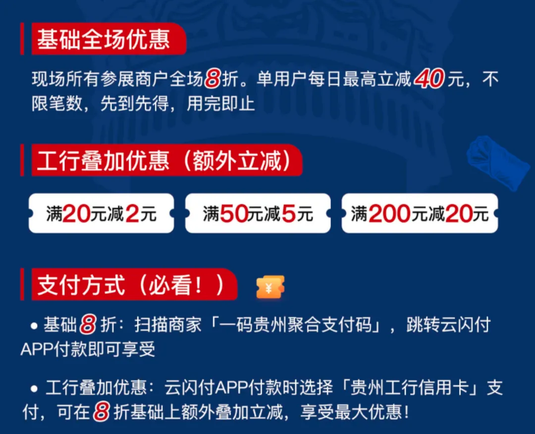 食博会现场消费,认准「一码贵州聚合码+云闪付」支付,即可享受8折消费券优惠,单用户每日累计最高可减40元,优惠次数不限,福利先到先得。