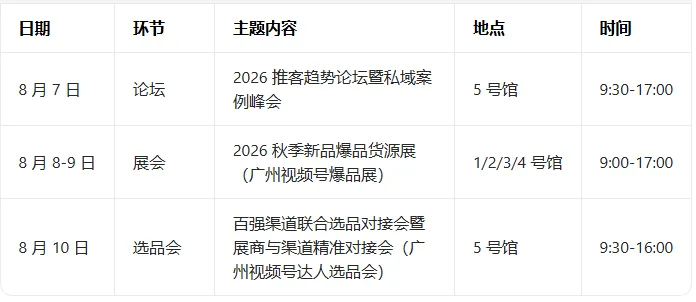 8 月 7 日的趋势论坛,是你了解 2026 下半年私域与视频号玩法的黄金机会,提前锁定行业趋势,才能在旺季快人一步。 8 月 8-9 日的展会,是万款爆品集中亮相的核心时段,建议提前规划好逛展路线,高效对接优质供应链。 8 月 10 日的选品会,汇聚私域头部渠道与视频号达人,是品牌方与达人精准对接、快速起量的关键环节。
