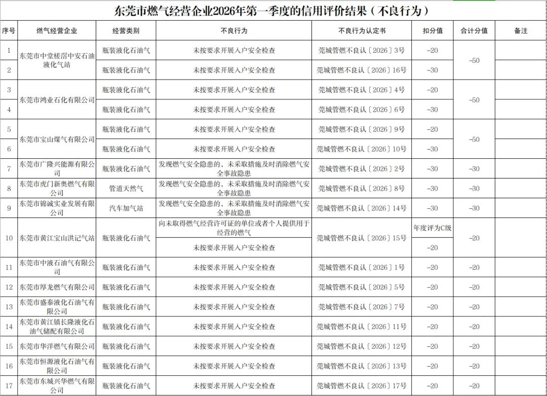 此外,东莞市虎门新奥燃气有限公司因“发现燃气安全隐患,未采取措施及时消除燃气安全事故隐患”被扣30分;东莞市东城兴华燃气有限公司因“未按要求开展入户安全检查”被扣20分。