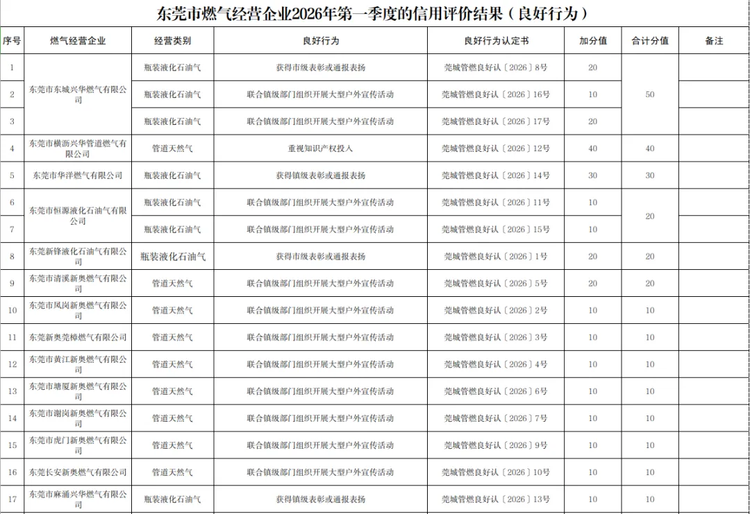 根据《东莞市城镇燃气经营企业信用评价实施办法(修订版)》,东莞市城市管理和综合执法局公布了2026年第一季度东莞燃气经营企业信用评价结果。