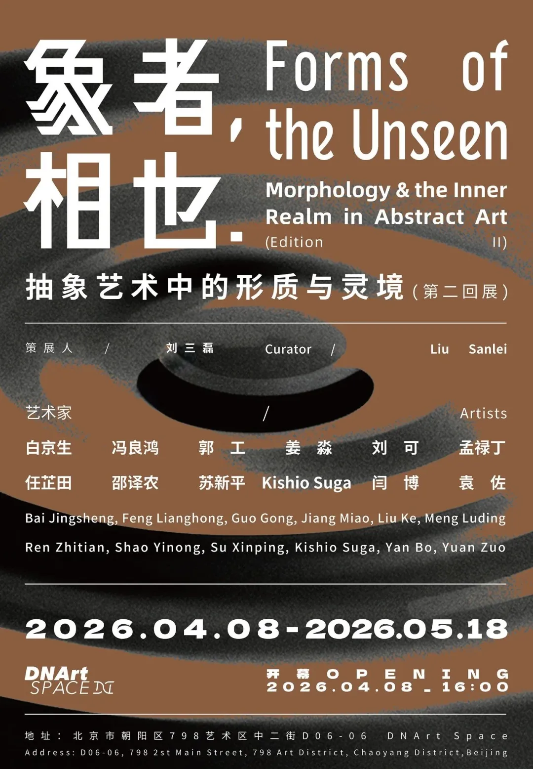 本次展览由刘三磊策展,邀请白京生、冯良鸿、郭工、姜淼、刘可、孟禄丁、任芷田、邵译农、苏新平、菅木志雄(Kishio Suga)、闫博、袁佐等12位艺术家共同参与。展览以“象者,相也”为题,延续对“形与质、见与识”的深层追问,呈现抽象艺术中物质形态与精神灵境的对话。展品涵盖布面油画、布面丙烯、铜版画、矿物颜料、装置等多种媒介,邀请观众在“着相”与“破相”的辩证中重新学习观看与感知。