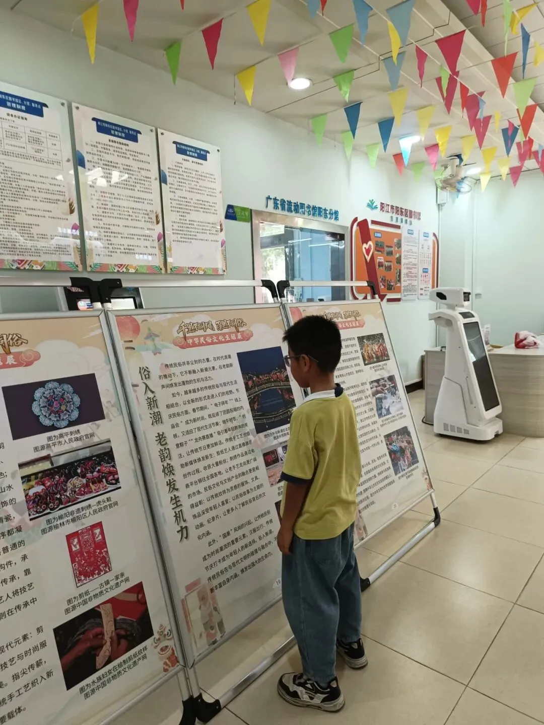 2026年3月25日至4月10日,由阳江市图书馆主办、阳东区图书馆协办的“千里不同风,百里不同俗——中华民俗文化主题展”在阳东区图书馆一楼大厅展出。 展览系统介绍了各地婚嫁、节庆、饮食等民俗差异,配以生动的民间故事与非遗案例,共吸引1820人次读者参观,反响良好。本次巡展让基层群众领略了中华文化的多元魅力,增进了对民俗传统的理解与认同。