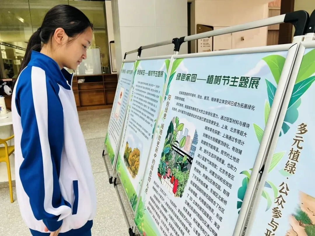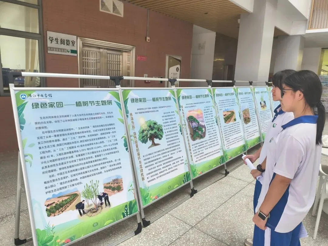 2026年3月26日,由阳江市图书馆主办、阳江市第一中学协办的“绿色家园——植树节主题展”在阳江市第一中学图书馆一楼户外大厅展出。 展览围绕植树造林与生态保护设计图文并茂的展板,兼具知识性与趣味性,累计5000名学生参与观看。学校反馈展览有效增强了学生的环保责任感,建议今后与主题班会、互动问答或数字化内容进一步融合,让绿色理念更深入地扎根校园。