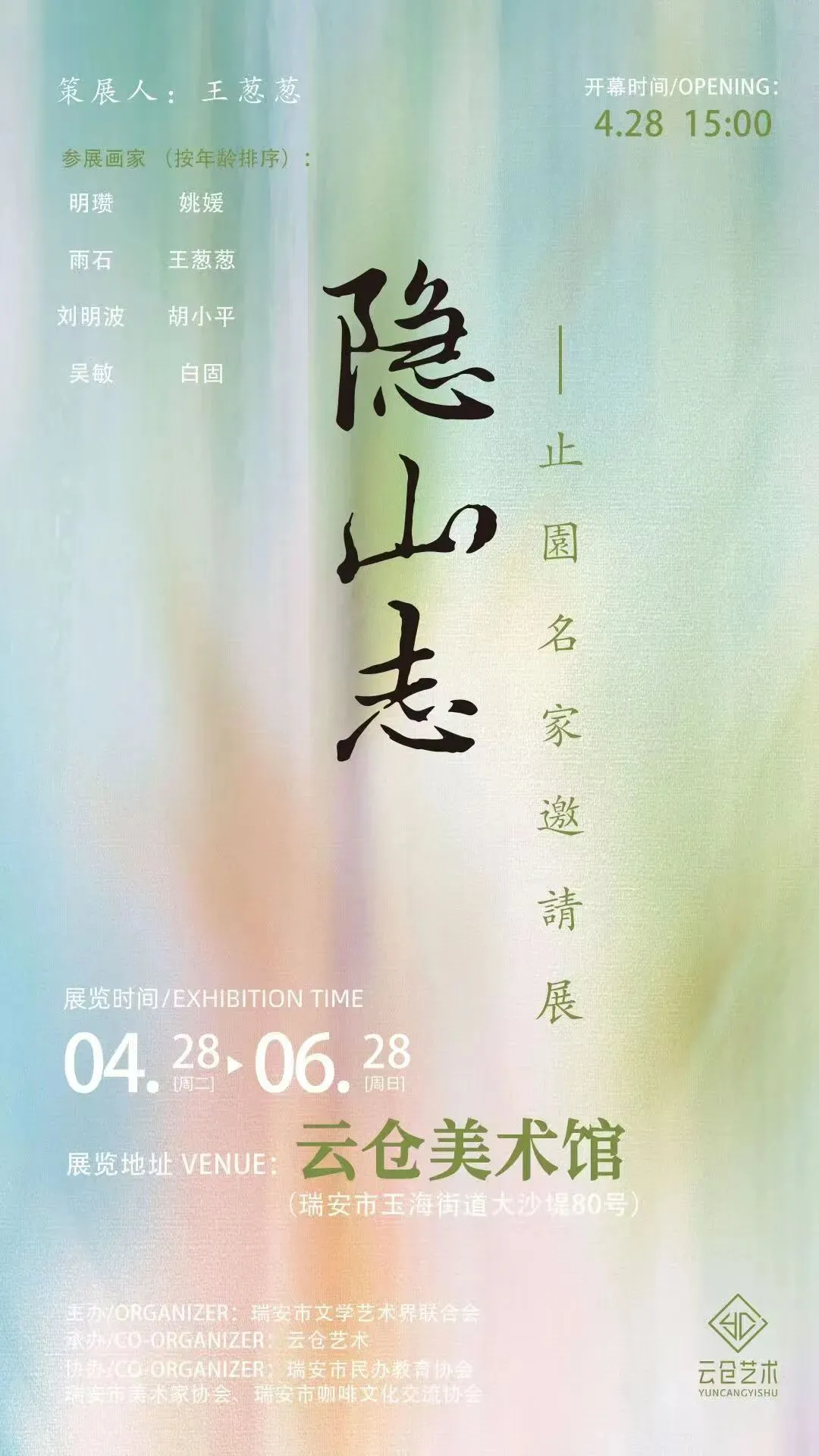 此次展览邀请的艺术家有:著名艺术家明瓒先生、独立艺术家雨石先生、山东师范大学美术学院院长刘明波先生、南京开明书画院院长姚媛女士、宁波浙江万里学院吴敏教授、浙江画院专职画师王葱葱女士、上海获奖专业户胡小平先生、90后国家二级美术师白固先生。他们的作品各具鲜明的个人艺术风格,学术性与当代性的探索在业内皆有所成。此次展览作品以小品为主,展于传统的木制院式建筑中,是传统与当代相结合的视觉呈现。定会给瑞安市民带来一场无与伦比的沉浸式饕餮盛宴。