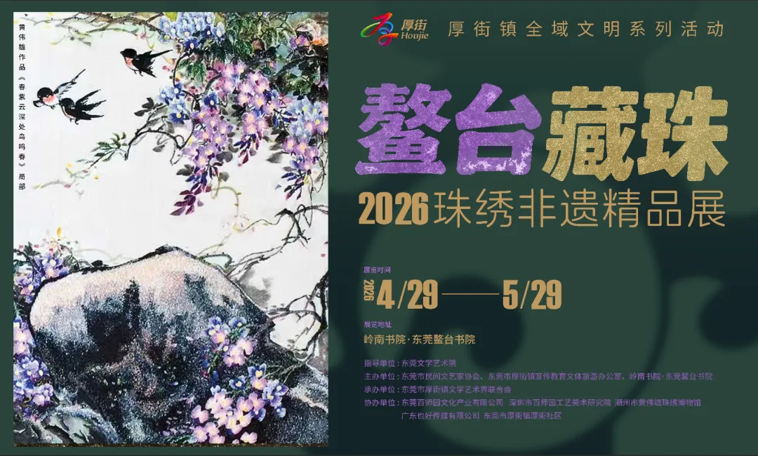 鳌台藏珠——2026珠绣非遗精品展于2026年4月29日至5月29日在岭南书院·东莞市鳌台书院展出。本次展览由东莞文学艺术院指导,东莞市民间文艺家协会、东莞市厚街镇宣传教育文体旅游办公室、岭南书院·东莞市鳌台书院联合主办,东莞市厚街镇文学艺术界联合会承办,东莞百师园文化产业有限公司、深圳市百师园工艺美术研究院、潮州市黄伟雄珠绣博物馆、广东也好传媒有限公司、东莞市厚街镇厚街社区协办。展览特邀中国工艺美术大师、国家级非遗项目粤绣(珠绣)代表性传承人、享受国务院特殊津贴专家、正高级工艺美术大师黄伟雄等业界翘楚,精心遴选近百件珠绣精品力作联袂呈现。