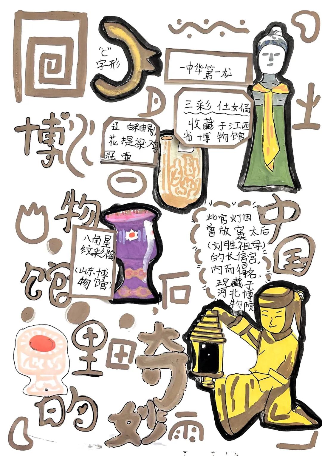 班会后,同学们还制作了构图精美、形象逼真、富有创意的“图说文物”画报,并利用课余时间,走进身边的博物馆,探索其中的奥秘。