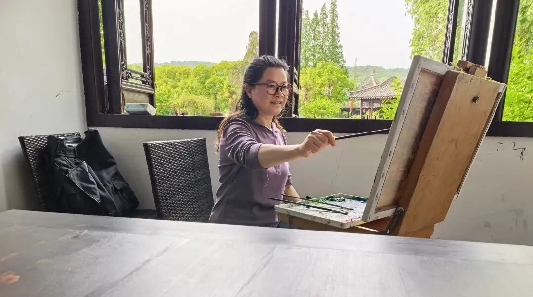 (正在画画的吴美林女士和她的二幅油画作品)