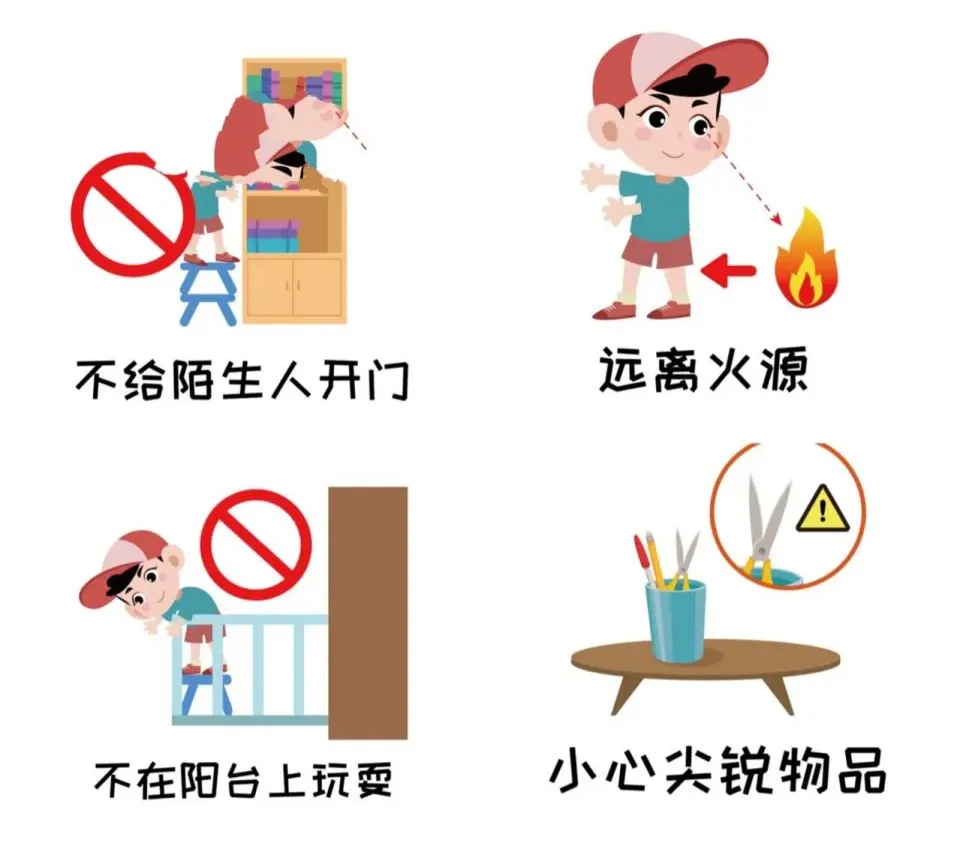 告诉孩子不乱动乱拆电线、插座和电器设备,不私自打开煤气阀门,避免发生火灾或煤气中毒事件。不在阳台、窗户等危险的地方玩耍,谨防高空坠落。孩子独自在家时,不给陌生人开门,注意防骗、防盗、防抢。