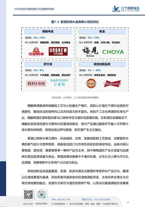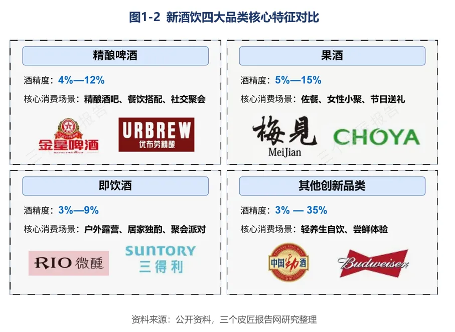 狭义层面,新酒饮特指以悦己消费为核心驱动,以低酒精度、多元风味、便捷饮用为特征,以Z世代、女性群体为目标客群的新型酒精饮料品类,涵盖精酿啤酒、果酒、RTD即饮酒、露酒、气泡酒等。