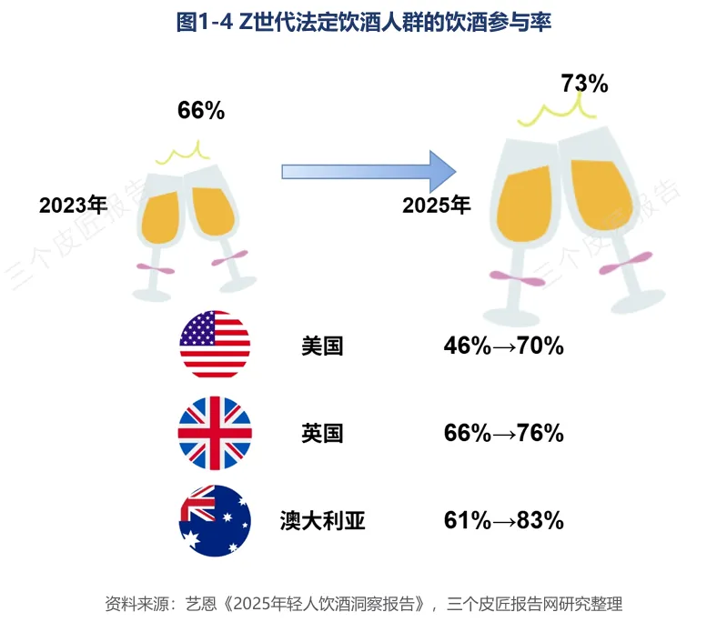 Z世代(1995-2009年出生)人口2.3亿,进入法定饮酒年龄的比例从2023年的66%升至2025年的73%,其饮酒动机高度集中于“悦己”“解压”“社交分享”,对预调鸡尾酒、硬苏打、果酒等品类的尝试意愿是X世代的2.3倍。女性消费者在低度潮饮赛道占比高达61%,淘天集团数据显示酒类消费男女比例已从7:3变成5:5。