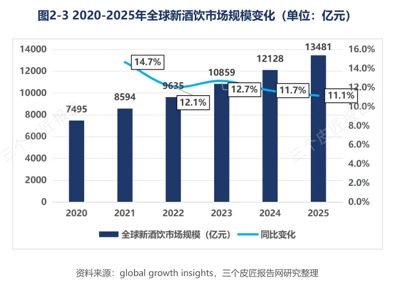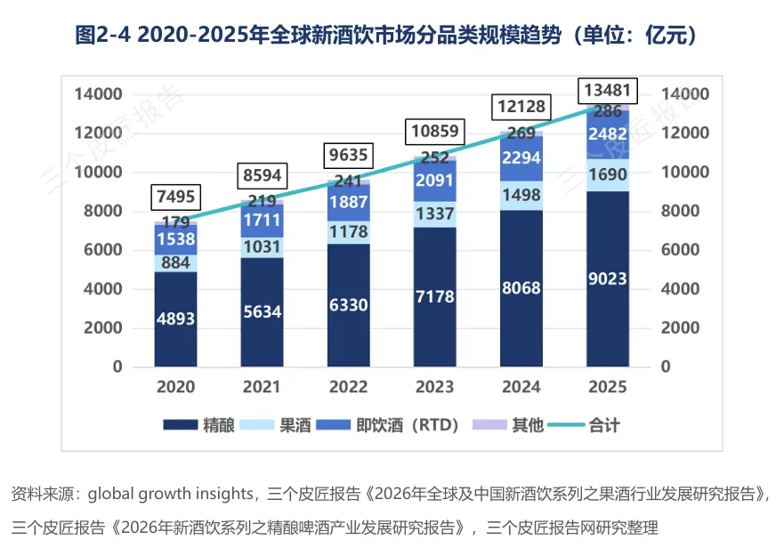2020年至2025年,全球新酒饮市场规模从7495亿元增长至13481亿元,累计增幅约80%,年均复合增长率约12.5%。2024年至2025年单年增量约1353亿元,为五年内最大绝对值增长。精酿啤酒占66.9%,即饮酒(RTD)占18.4%,果酒占12.5%,其他品类占2.1%。