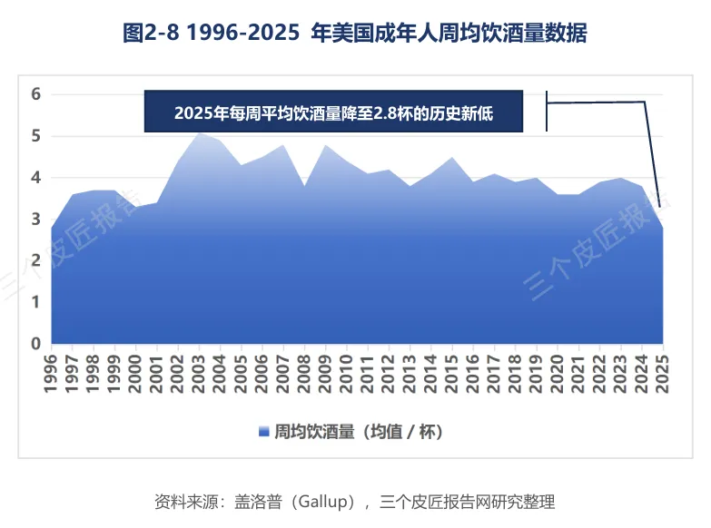 美国成年人饮酒比例已降至54%,为近一个世纪最低水平;每周平均饮酒量降至2.8杯的历史新低。