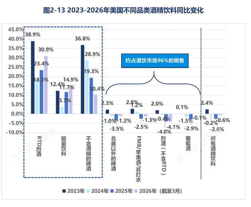2. 美国市场:传统品类全面收缩,RTD烈酒增速30.9%