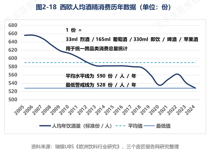 西欧人均酒精消费从2005年约656标准份/人/年降至2024年528标准份/人/年,累计降幅近20%。