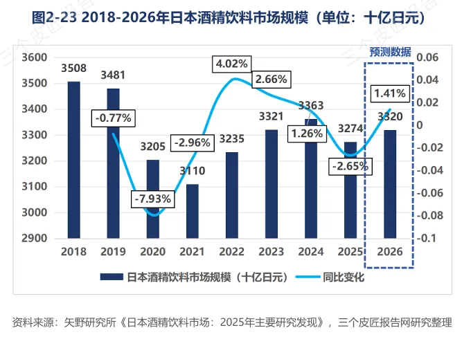 日本酒精饮料市场2025财年预计降至3.27万亿日元,同比下降2.6%。