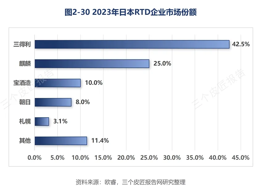 三得利以42.5%的销量市占率稳居RTD品类首位,麒麟以25.0%位列第二。