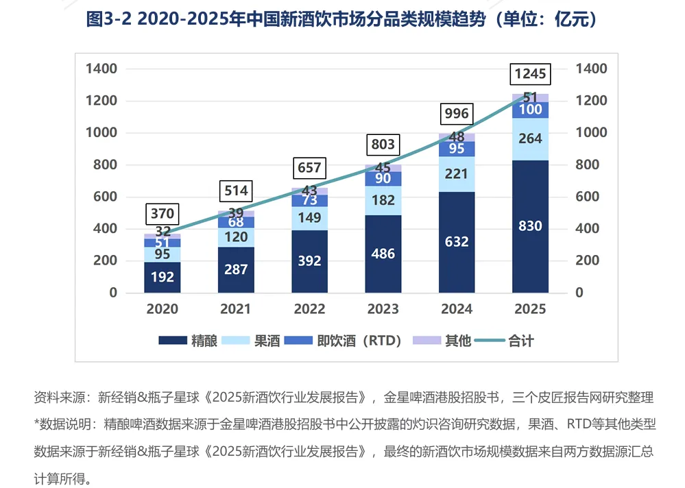 2020年至2025年,中国新酒饮市场规模从370亿元增长至1245亿元,累计增幅达236%,年均复合增长率约27.5%。2024年至2025年单年增长约249亿元,为五年内最大单年增量。精酿啤酒830亿元(占比约67%),果酒264亿元(21%),即饮酒100亿元(8%),其他品类51亿元。