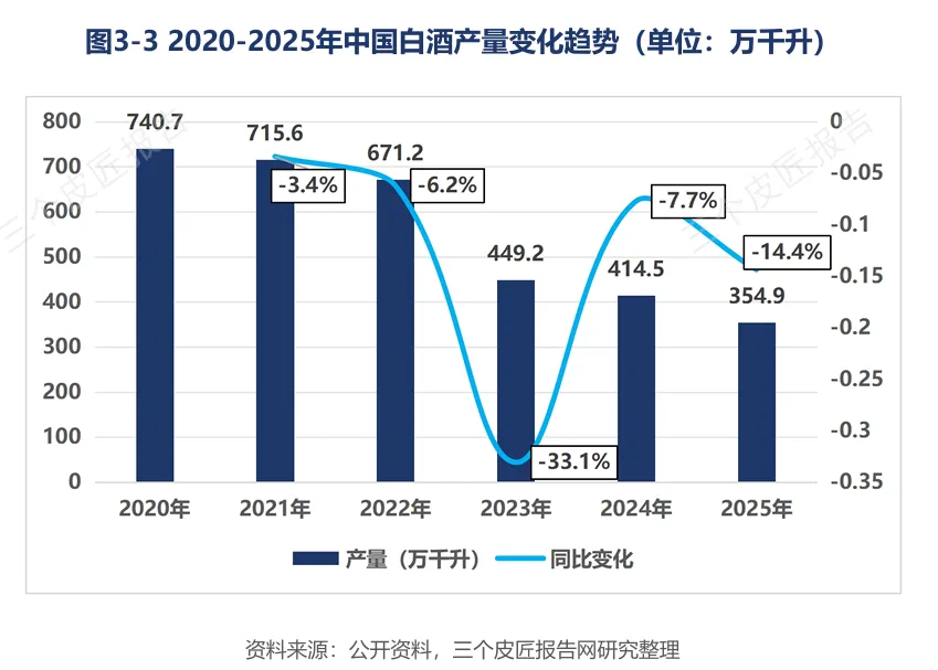 2020年至2025年,规模以上白酒企业产量从740.7万千升降至354.9万千升,六年累计降幅达52.1%。