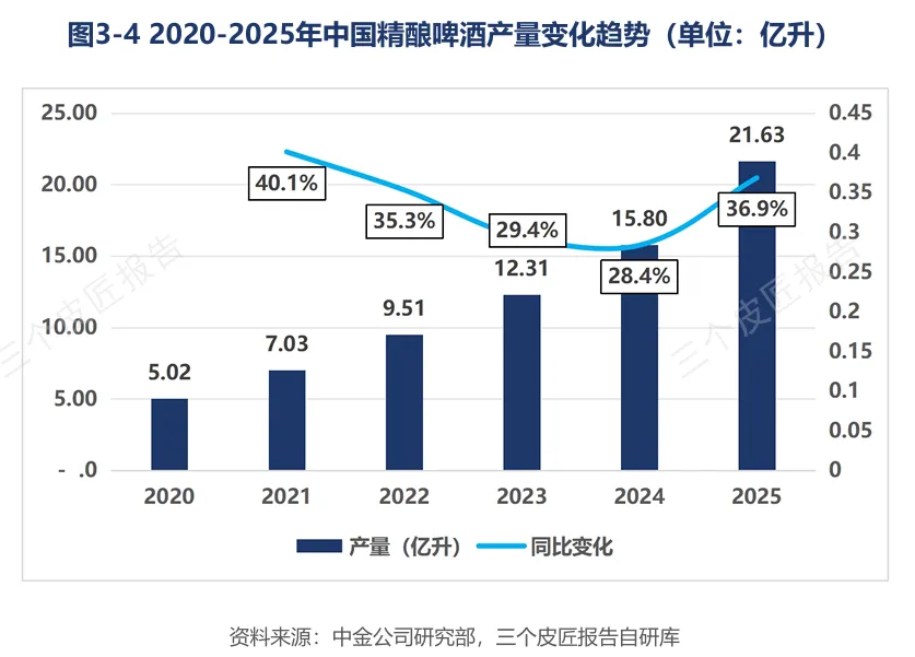 同期,精酿啤酒产量从5.02亿升增至21.63亿升,六年累计增幅达331%,年均复合增长率约34%。白酒产量的持续下行与新酒饮产量的加速扩张,构成了中国酒业最鲜明的结构性对比。