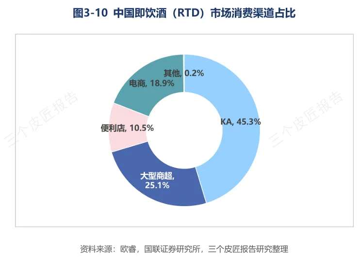 即饮酒(RTD):RIO以73%销量份额绝对主导,Vanguard动力火车约18.5%。非即饮渠道占比超90%,KA渠道占45.3%,电商占18.9%,便利店占10.5%。