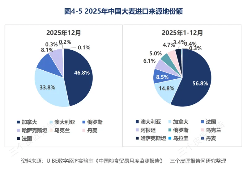 2025年,中国大麦进口1042.3万吨,其中澳大利亚占56.8%,加拿大占14.8%。