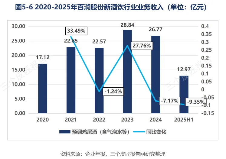 百润股份(RIO)预调鸡尾酒业务2023年达28.84亿元峰值后进入调整,2025年上半年收入同比降9.35%。