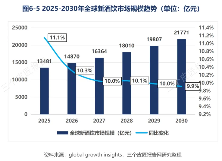2026年至2030年,全球新酒饮市场规模预计从约15000亿元增长至21771亿元,年均复合增长率约9.9%。RTD与无醇啤酒仍为增长双引擎,功能性新酒饮加速渗透。