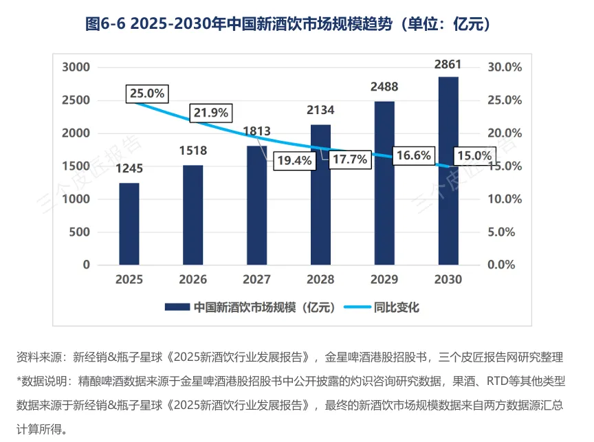 2026年至2030年,中国新酒饮市场规模预计从1518亿元增长至2861亿元,年均复合增长率约18.1%。精酿啤酒的高端化升级、果酒的场景渗透与风味创新、即饮酒的即时零售驱动,以及功能性新酒饮的品类突破,将构成核心增长主线。