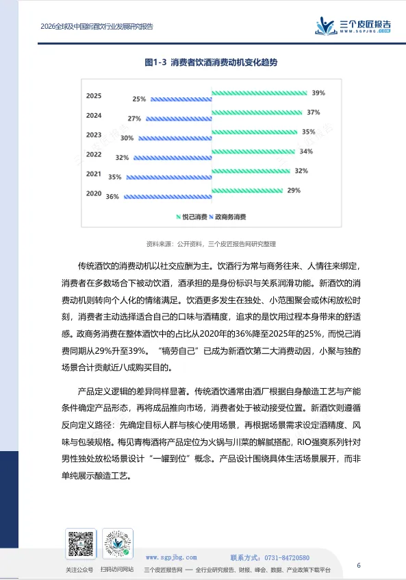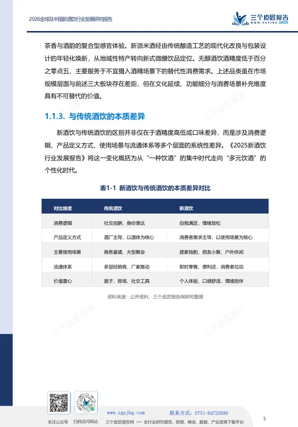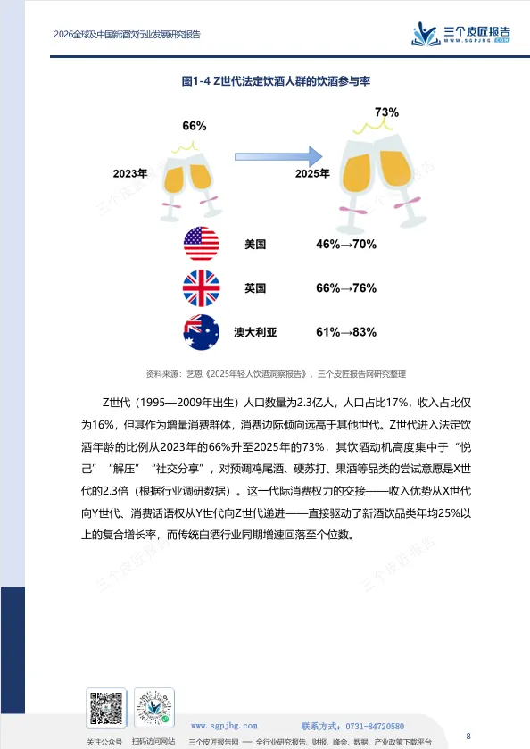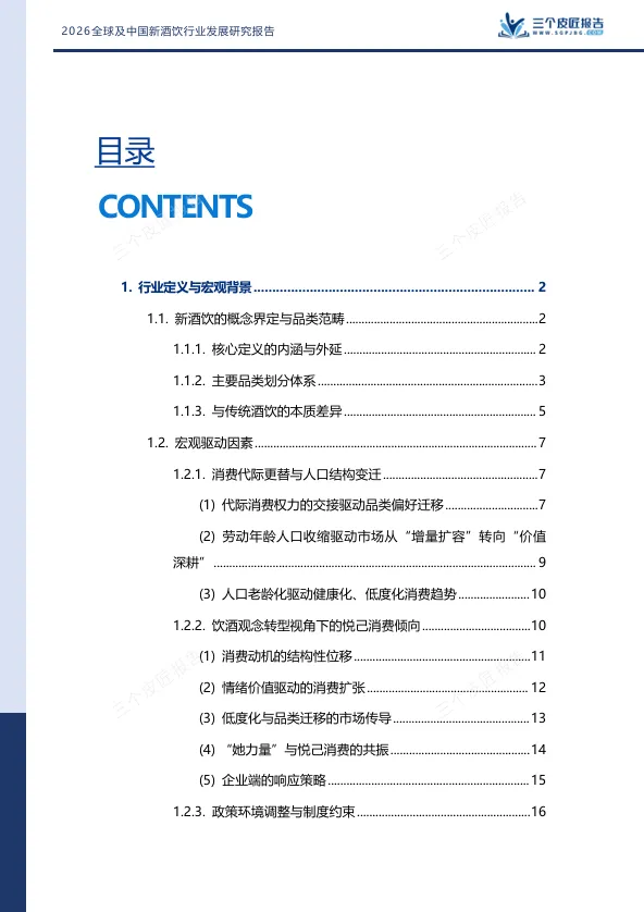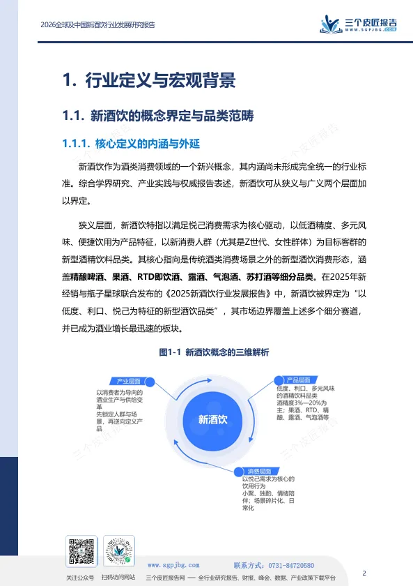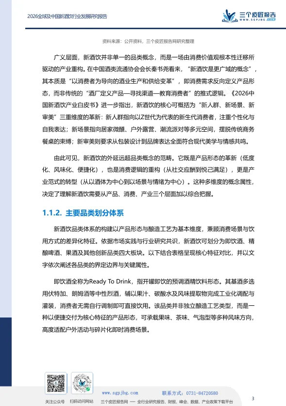 三个皮匠报告发布的《2026全球及中国新酒饮行业发展研究报告》指出,新酒饮并非传统酒饮的简单替代,而是一场由消费代际更替、场景碎片化与价值逻辑迁移共同驱动的产业级重构。报告的核心判断是:消费主权已从生产端向消费端根本性转移,酒饮产品正从“身份符号”向“情绪载体”加速迁移。