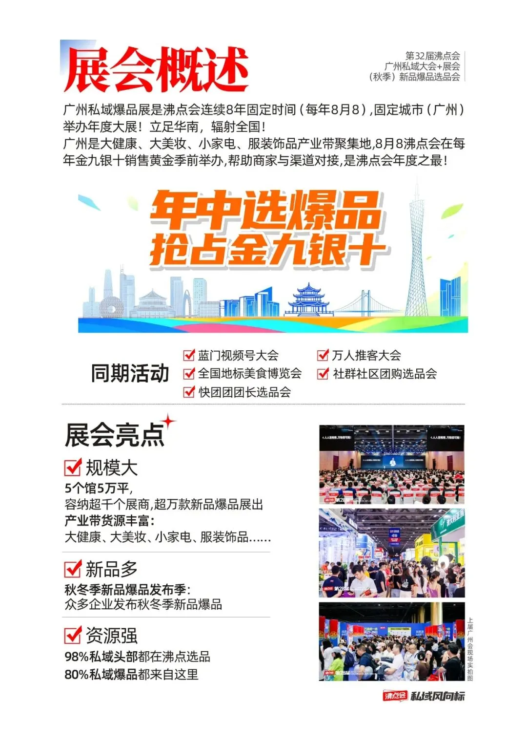 2026 年私域增长,选对平台事半功倍!被称为 “私域风向标” 的第 32 届沸点会・广州私域爆品展,8 月 7-10 日将在广州保利世贸博览馆重磅启幕。5 万㎡超大展区、5 大主题展馆、1000 + 优质展商、10000 + 新品爆品,汇聚私域全赛道资源,是下半年对接渠道、抢占 “金九银十” 旺季的黄金机遇。不管你是想选品对接的渠道方,还是想拓客出圈的品牌方,这份超全参会指南,直接收藏!