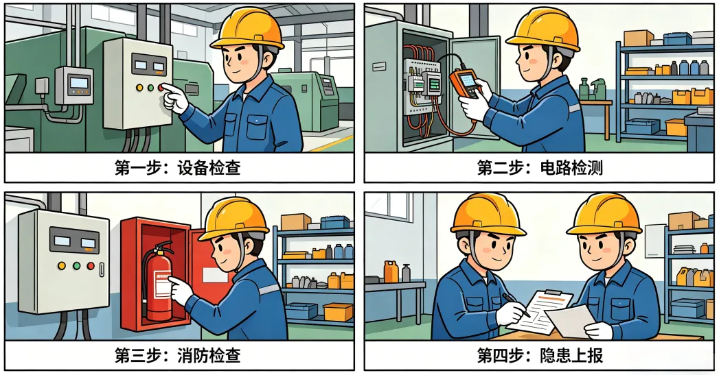 - 电气安全:检查电气线路、配电箱、开关盒是否存在老化、破损、裸露、私拉乱接现象,杜绝堆放杂物、超负荷用电,确保电器设备规范接地、正常运行。