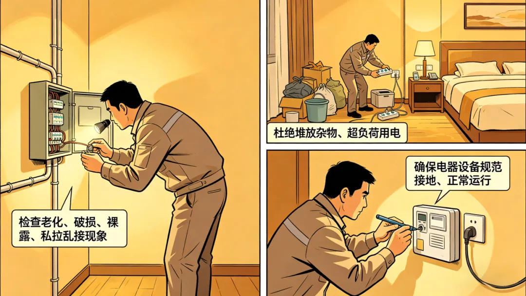 加强员工安全培训,杜绝疲劳上岗、违规操作;提醒入住客人规范使用电器、注意人身财产安全。