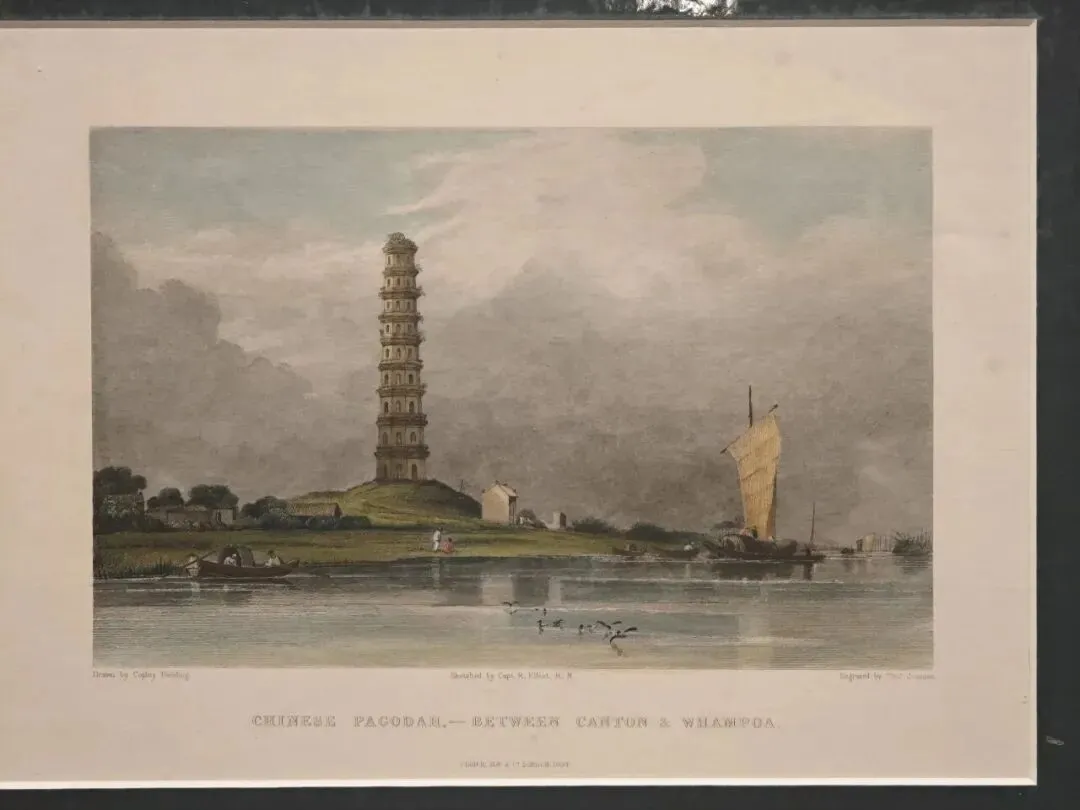 设色版画《广州与黄埔间的宝塔》(约1850年)
