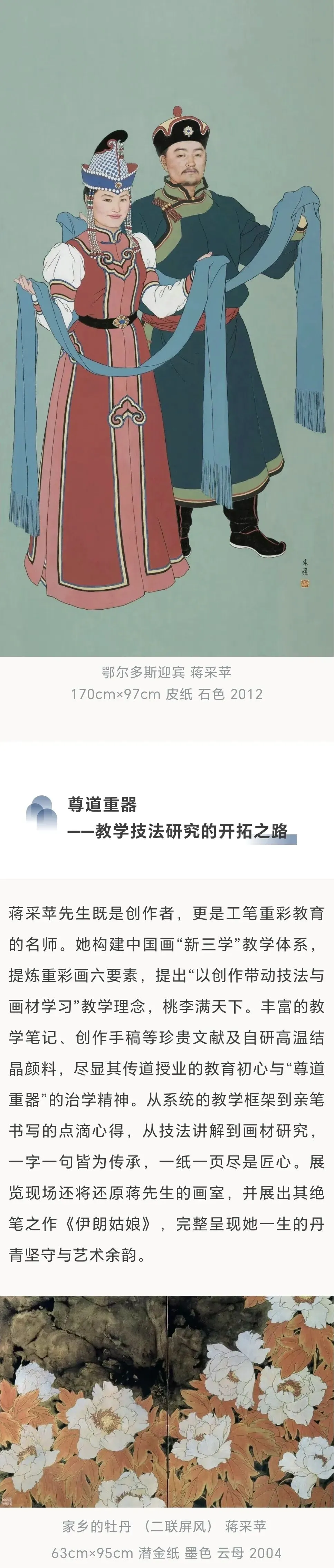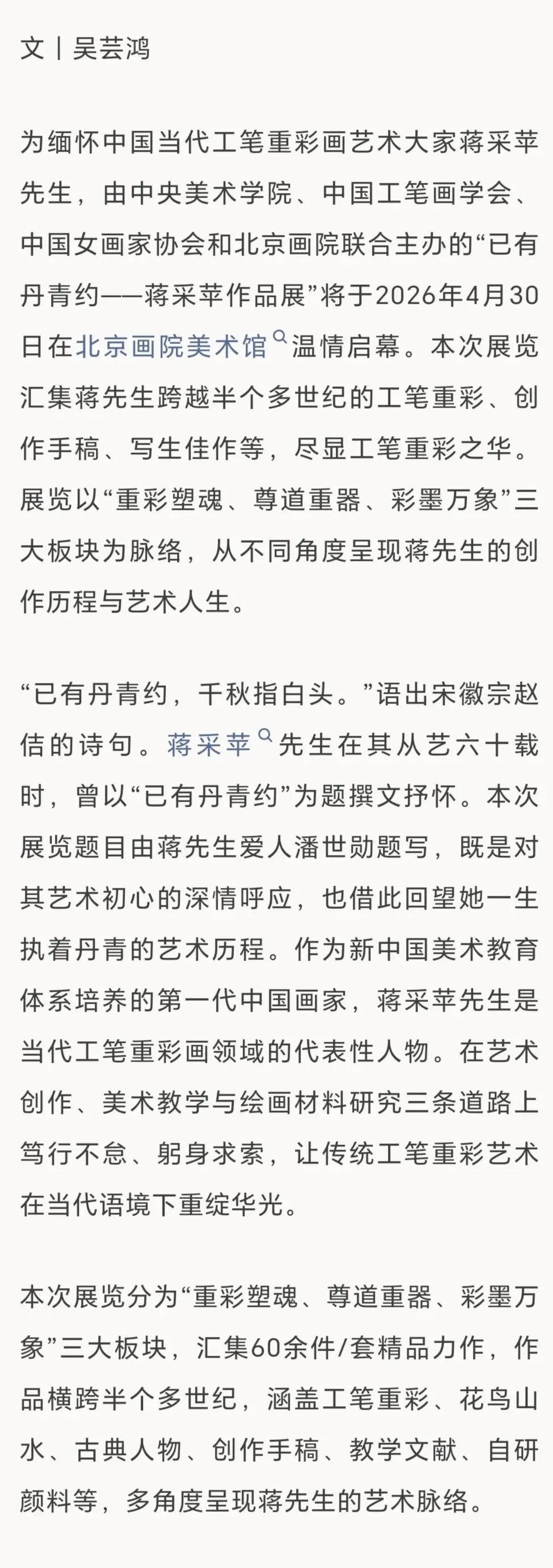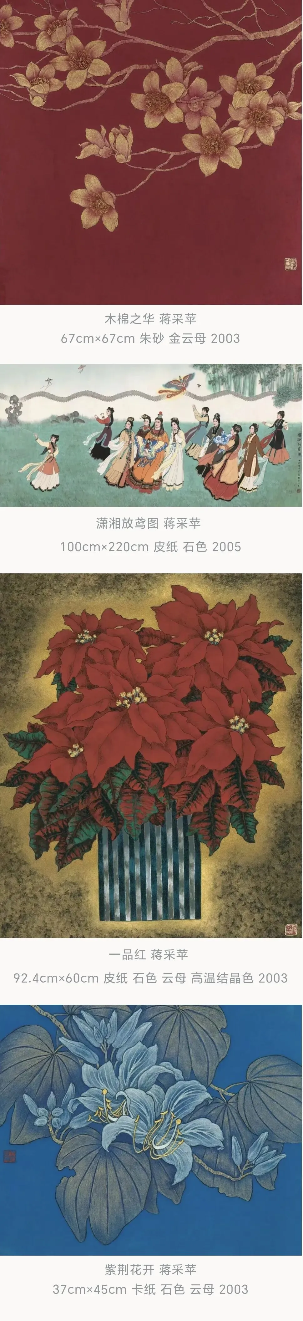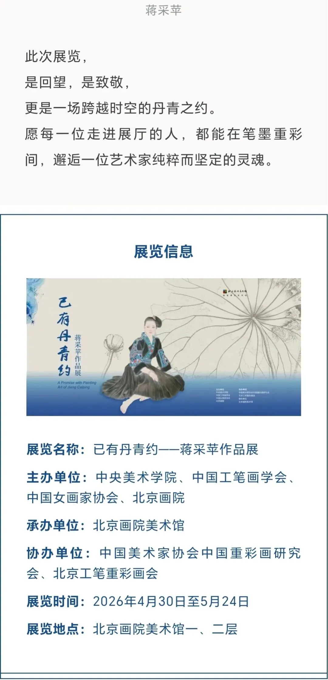 由中央美术学院、中国工笔画学会、中国女画家协会和北京画院联合主办的“已有丹青约——蒋采苹作品展”,将于2026年4月30日在北京画院美术馆启幕。蒋采苹先生是我国著名重彩画家、美术教育家,曾任中国工笔画学会常务副会长、中央美术学院教授。蒋先生为中国工笔画学会的创建与发展作出了卓越贡献,毕生致力于工笔画的艺术实践与人才培养,积极推动中国工笔画的传承与创新。此次展览的举办,也寄托着我们对先生的深切缅怀。