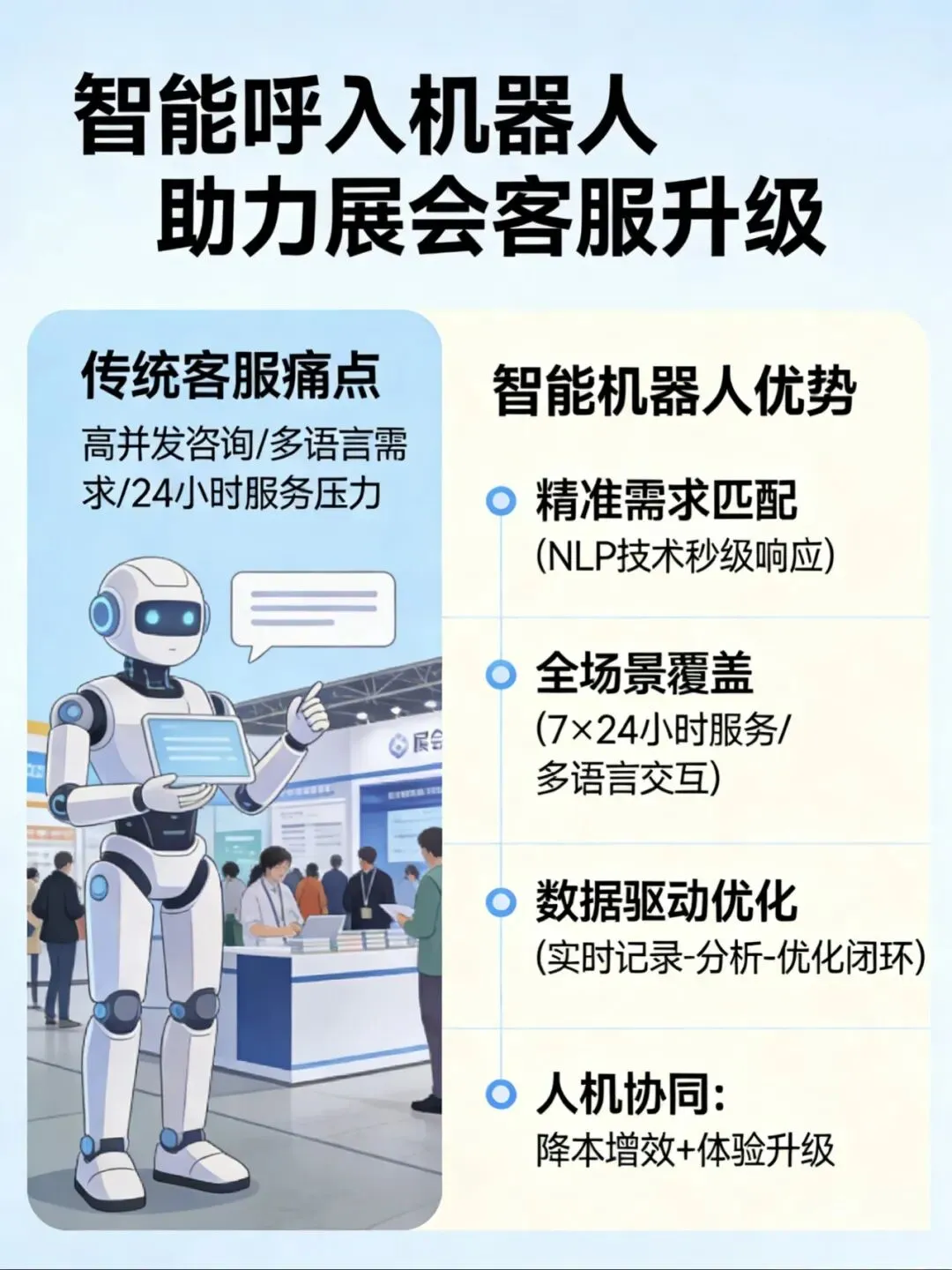 ?还在为展会现场人潮拥挤、信息传达不到位而头疼吗?智能机器人系统24小时不间断工作,让展会体验升级再升级!✨ ?信息查询?一触即发!展会地图、展商信息、活动安排……智能机器人秒变“活地图”,参观者只需轻轻一问,所有信息一目了然,再也不用在人群中盲目寻找啦!?️ ?互动交流?智能机器人不仅能与参观者进行趣味对话,还能收集反馈意见,为展会主办方提供宝贵的数据支持,让展会越办越精彩!?