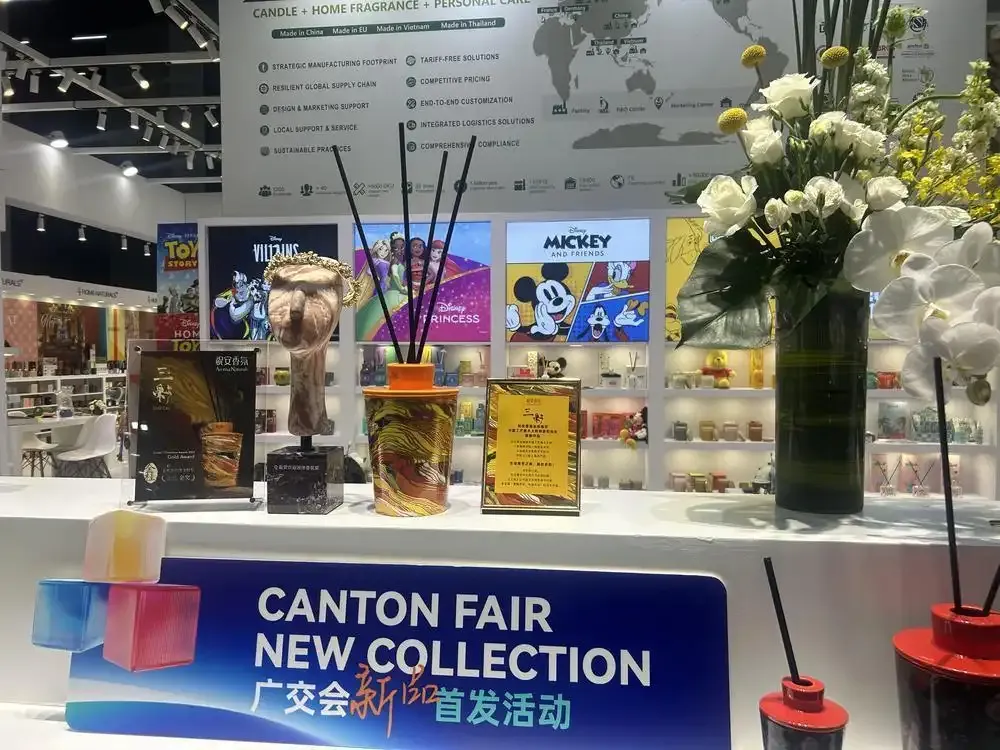 大连达伦特集团的展位前,不时有采购商驻足闻香。这家“国家级绿色工厂”已经连续多年参加广交会。旗下祝安香氛品牌以乳木果蜡为核心原料——相比传统石蜡,这种碳中和材料能大幅降低碳排放。产品还融入了补充替换装概念,瓶器可以重复使用。更让人眼前一亮的是设计:唐三彩的釉色、丝绸之路的意象,被巧妙融入现代香氛之中,既有观赏性又传递了可持续发展理念。