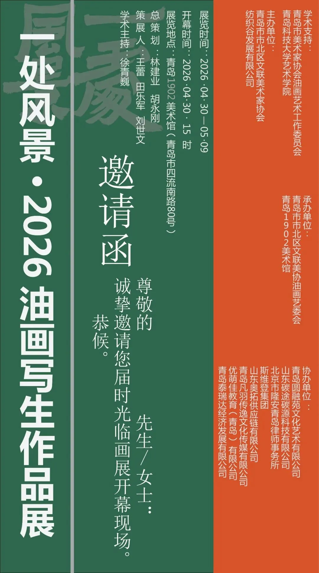 本次展览由青岛市美术家协会油画艺术工作委员会、青岛科技大学艺术学院学术支持,青岛市市北区文联美术家协会、纺织谷发展有限公司主办,青岛市市北区文联美协油画艺委会、青岛1902美术馆承办。展出油画作品100余幅。尽显岛城油画创作者的多元艺术探索与鲜活创作生态。