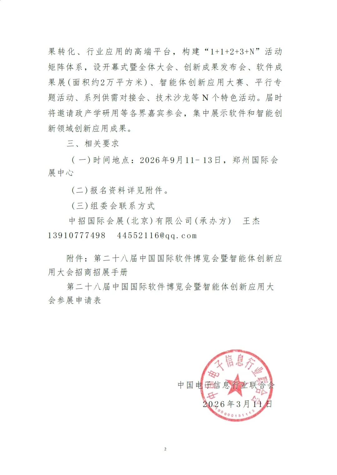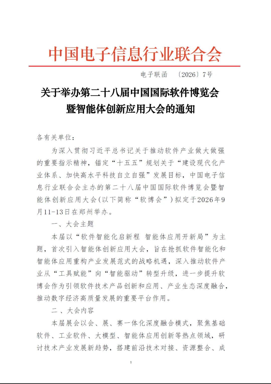 中国国际软件博览会(简称“软博会”)已成功举办二十七届,是我国软件和信息技术服务领域规模最大、持续时间最长、最具影响力的专业盛会,历年来软博会都得到了国家和社会各界的高度关注-2026第二十八届中国国际软件博览会暨智能体创新应用大会将于2026年09月11日-13日在郑州国际会展中心再次盛大举办。有意参展的单位可以与中招国际会展(北京)有限公司联系报名参展。联系人:王杰13910777498