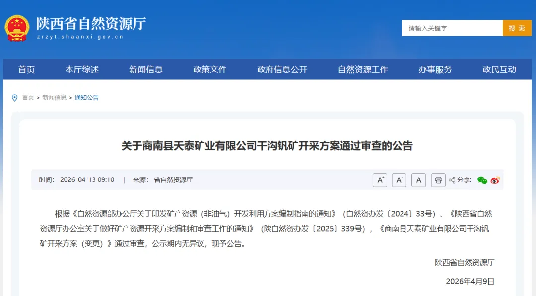 此前,其矿山地质环境保护与土地复垦方案也已通过评审,明确了23.3年的治理规划周期。钒作为应用于新能源储能等领域的关键战略金属,该项目的推进有助于盘活区域资源,完善钒产业链条,为商南县打造钒科技产业园、培育县域经济新引擎提供支撑。下一步,企业将严格按照方案加快基建,打造安全、绿色、高效的现代化矿山。