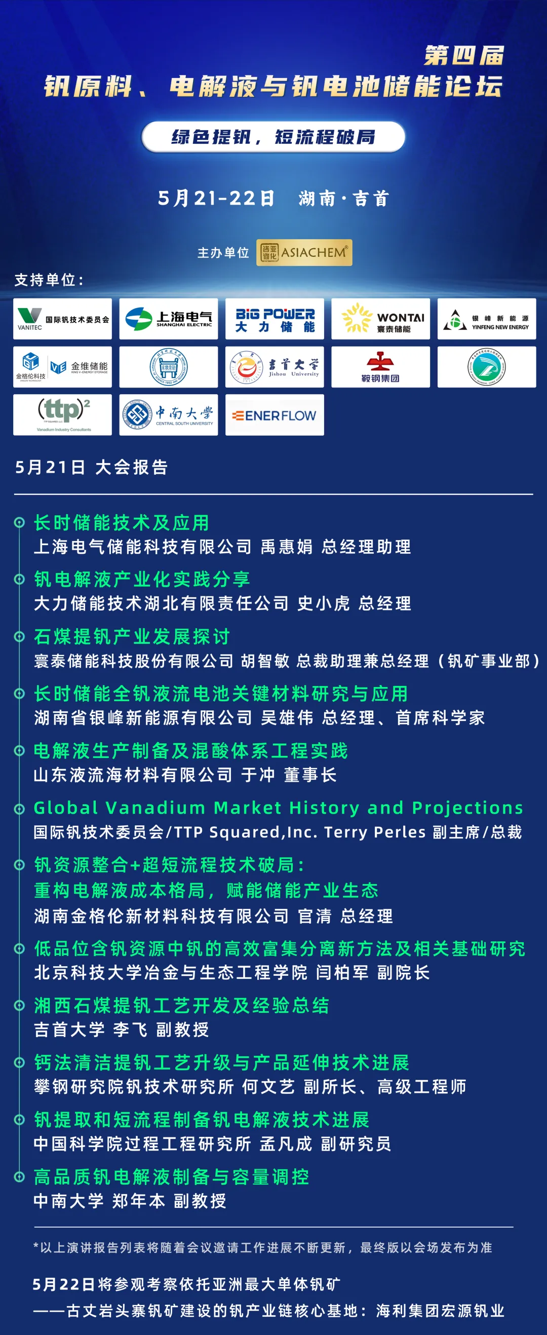 第四届钒原料、电解液与钒电池储能论坛将于5月21-22日在湖南吉首召开。来自上海电气储能、寰泰储能、大力储能、攀钢钒钛、银峰新能源、中科院过程所、北京科技大学、吉首大学、金格伦新材料等单位的专家将作精彩报告。