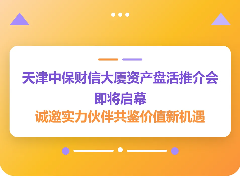 为盘活存量资产,释放核心价值,国投集团旗下中国投融资担保股份有限公司现正式启动所属优质资产——天津中保财信大厦的公开招商。特举办本次专场推介会,系统介绍该物业的区位优势、资产价值与盘活潜力,诚邀各位嘉宾拨冗出席,共赢未来。
