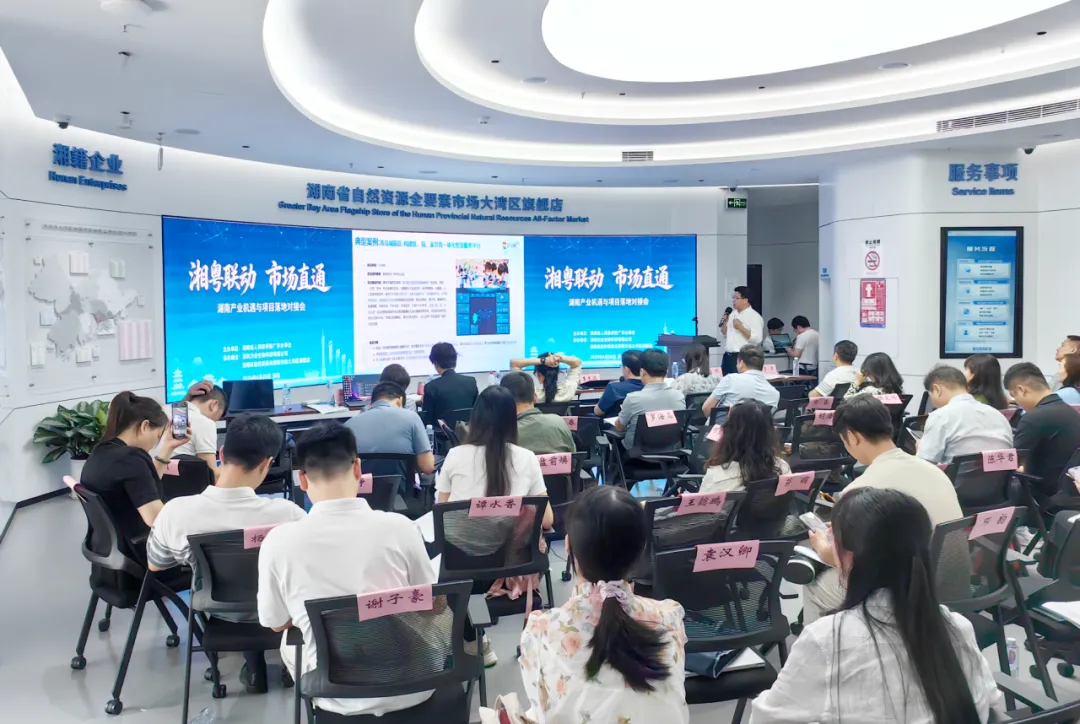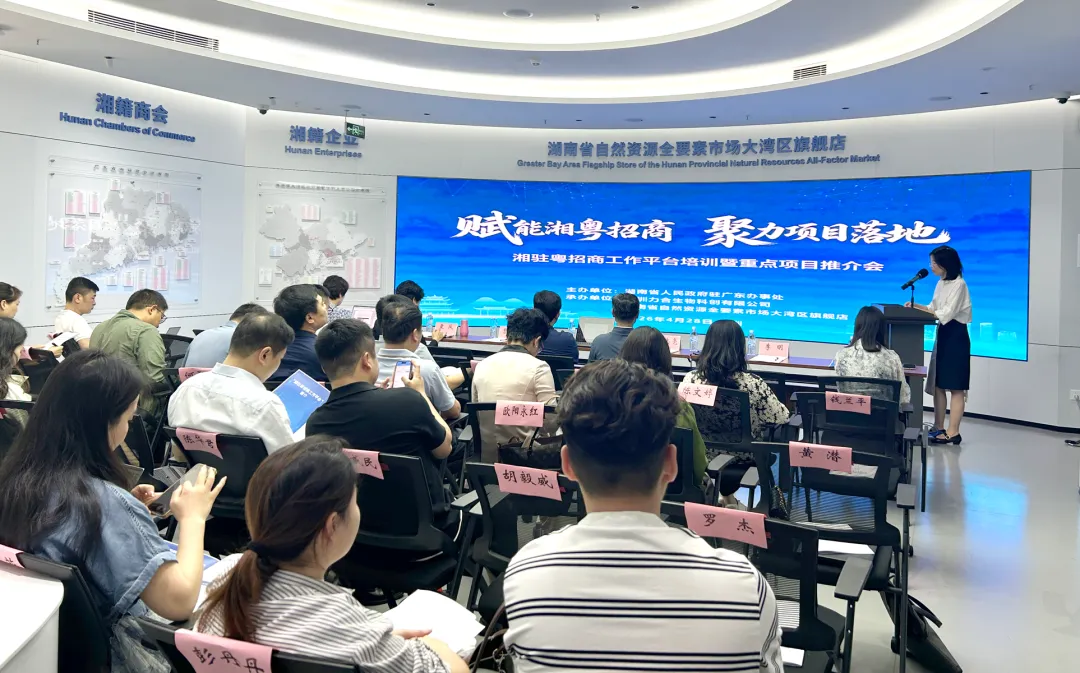 4月28日上午,由湖南省人民政府驻广东办事处主办,深圳力合生物科创有限公司与湖南省自然资源全要素市场大湾区旗舰店联合承办的湘驻粤招商工作平台培训暨重点项目推介会在大湾区旗舰店一楼展厅顺利召开。来自长沙、株洲、常德、邵阳、永州等市州的招商团队及园区负责人,企业与金融机构代表共60余人参加活动。
