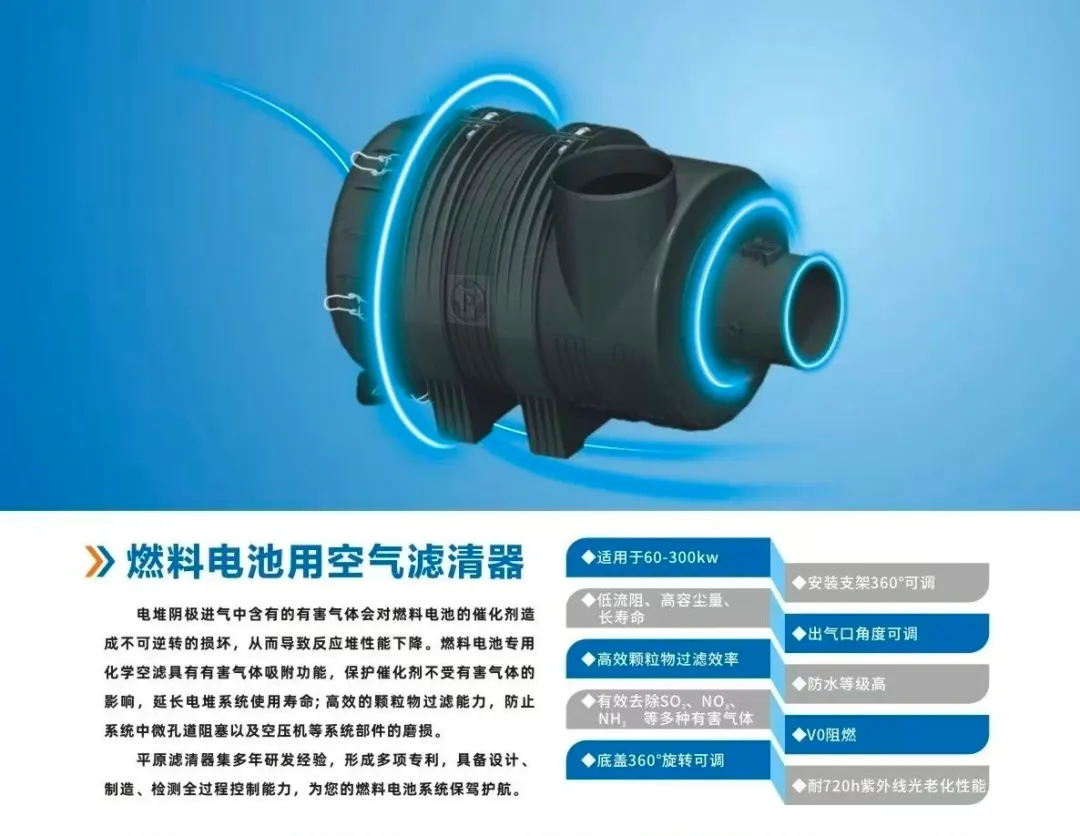 极致过滤效率:针对0.3微米颗粒物,过滤效率高达99.5%以上,确保进入电堆的空气极致纯净。