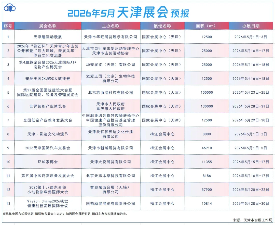2026年5月份,国家会展中心(天津)、梅江会展中心将举办展会活动13场。主要展会活动内容预报如下: